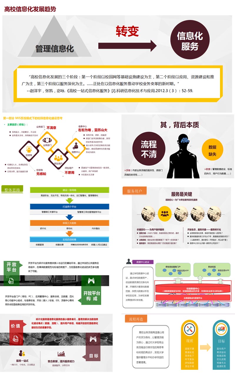 这5所高校转变思维方式,把“管理信息化”转为“信息化服务”,把“视角”由单纯辅助职能部门办公,转向为师生、学院、职能部门和学校领导提供全方位的直接服务。他们都不约而同的从打破各业务系统“数据烟筒”,整合数据、构建数据中心入手,用碎片化服务的新思维,以“网上办事大厅”、“综合服务平台”、“信息门户”等形式,为师生提供“一表通”(各类填表自动生成)和“一站式办事”(网上办事)服务,为院、处、校各级领导提供多维度数据关联分析服务,以期形成良性的高校数据生态环境和开放式服务平台。