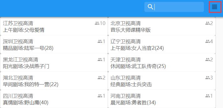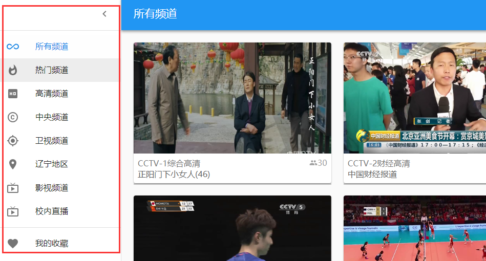 频道分类在左侧,点击左上角的菜单按钮可以显示频道分类的详细信息,如图。