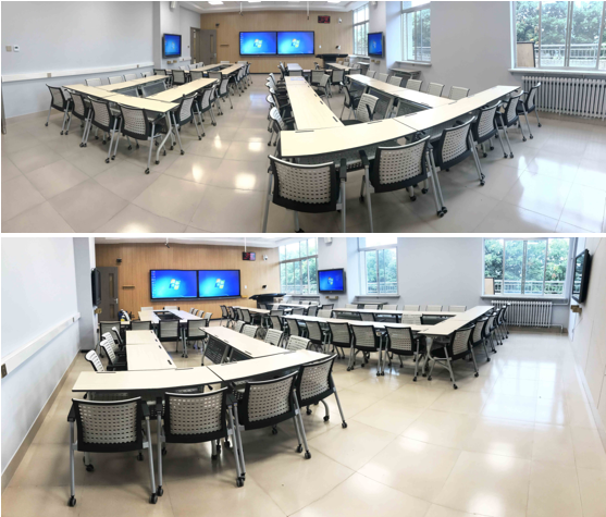 对所有的教室按照功能需求不同,整体划分为六种类型,除了已有的互动型、研讨型、探究型三种类型外,又增加了pbl型多媒体教室和微课教室,教师可以根据课程特色,更自由的选择教学环境,同时微课教室可以让教师一键录制教学视频,为网络教学空间建设和在线课程建设提供条件保障。除此之外,改造还有这些亮点:手机扫码签到让教师省去了传统点名的麻烦;无线投屏功能可以随时展示手机、平板中的课件;活动桌椅像积木一样可以随意拼接,更加方便了同学们的交流和互动;电子白板、一体机、玻璃绿板三种类型黑板让教师不用再去担心粉笔灰尘伤害健康。