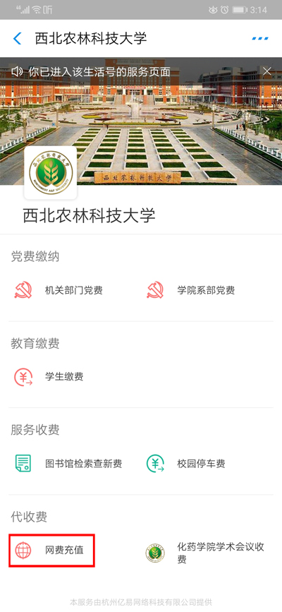 1、进入“西北农林科技大学”生活号,点击“缴费大厅”--“网费充值”--输入学号,选择或输入充值金额。