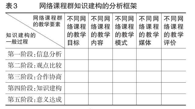 “课程群首先应该优化课程结构和教学内容,注重知识内容的渗透、融合与衔接,尽量合理避免内容的重复,从而提高课程整合化程度,完善人才培养目标和规格。” (允春喜等,2012) 网络课程群的知识建构分析需要从网络课程群系统与要素的关系出发,充分考虑不同网络课程以及教学体系之间的关系。将网络课程群的教学要素与知识建构的一般过程作为维度,可以构建出网络课程群知识建构的分析框架(见表3)。