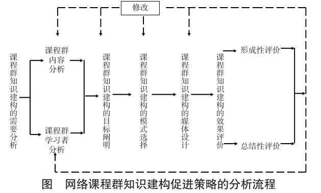 促进网络课程群的知识建构不是进行简单的课程组合,而是需要统筹规划网络课程体系,重新设计和整合网络课程,优化具体网络课程的教学内容,改革网络课程的教学模式。因此,我们可以根据信息化教学设计的基本原理和主要流程,在教学目标描述、学习者特征分析、教学模式应用、学习环境建构和教学评价开展等方面,探索网络课程群知识建构的教学设计,分析不同网络课程在教学目标、教学内容、教学模式、教学媒体和教学评价等方面的内在联系,完善网络课程群知识建构的教学活动,提出网络课程群知识建构的促进策略。网络课程群知识建构促进策略的分析流程见下图。