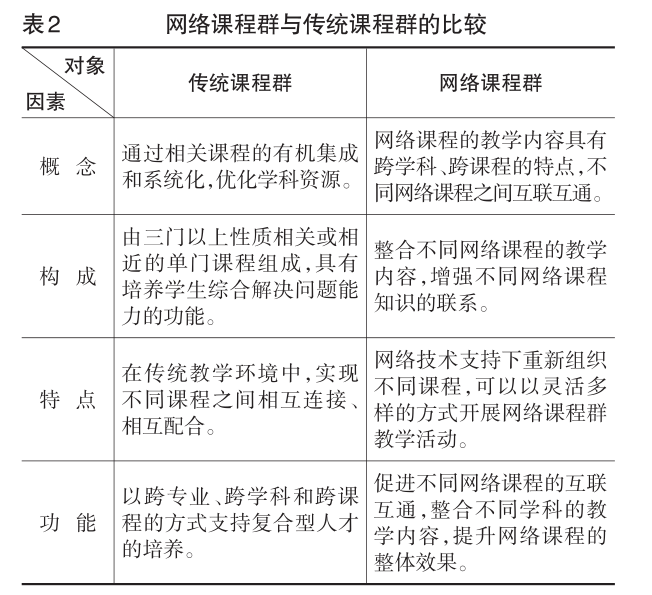 网络课程群是在网络2024德国欧洲杯官网的技术支持下对传统课程群进行的优化和改造,既能规避传统课程群的缺点,又能增强传统课程群的优势。网络课程具有网络环境的开放性、学习资源的共享性和信息传递的时效性,能够实现不同网络课程“由原来的相互隔离转变为相互贯通,由原来的相互重叠转变为相互补充,由原来的相互矛盾转变为相辅相成”。 (范钦珊,1997) 网络课程群与传统课程群的比较见下表2。