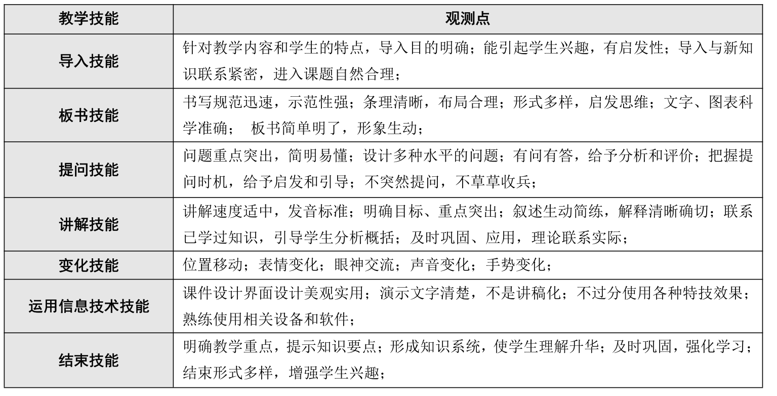 二 研究假设教学技能包含多种技能,本研究以《高等师范学校学生的教师职业技能训练大纲(试行)》 [4] 为蓝本,结合国内教学技能训练教程和高校教师常用教学技能,主要研究导入技能、板书技能、提问、讲解、变化、运用信息技术、结束等七种技能。研究假设如下: