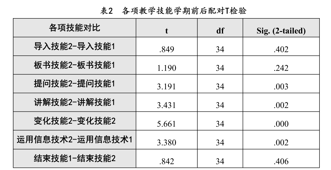 根据 t 检验结果表明:(1)提问技能、讲解技能、变化技能、运用信息技术技能在运用智慧教室及策略前后表现出显著的差异,且在运用智慧教室及策略后这些技能有显著的提高:提问技能、讲解技能、变化技能、运用信息技术技能的 p 值均小于 0.01。(2)在运用智慧教室前后导入技能、板书技能、结束技能无显著变化,p 值均大于 0.05。所以,假设 1“智慧教室系统能促进教师部分教学技能提高”成立。
