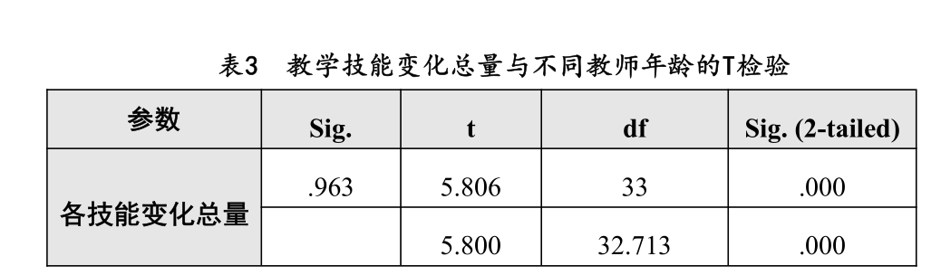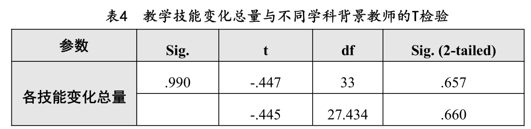 表4 教学技能变化总量与不同学科背景教师的t检验