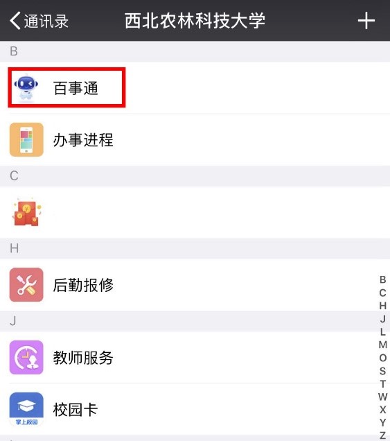 进入微信,在通讯录“我的企业”中找到“西北农林科技大学”企业号并点击进入,找到“百事通”,进入后即可使用。(需要关注我校企业号并认证,我校企业号使用方式见)