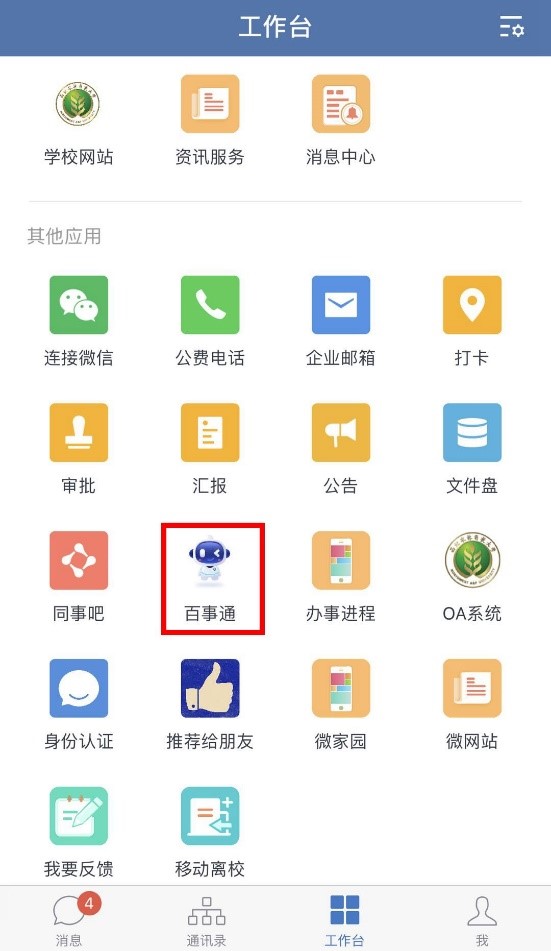 进入企业微信app,进入“工作台”页面,找到“百事通”,点击进入即可使用。(需要下载企业微信app,加入我校企业并认证)