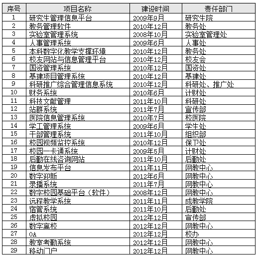 负责数字校园建设规划、技术规范与信息标准制定,负责校园网基础平台建设维护、数字迎新系统的建设维护,负责校园一卡通、安防监控后台系统的建设维护动工作。目前已经建成的数字校园业务系统29个:
