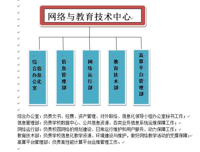 中心下设5个业务单元,分别为综合办公室、信息管理部,教育技术部、网络运行部、高算平台管理部,现有员工36名,其中教授1人,副高职称5人。管理岗10人,技术岗17人,工勤岗9人。